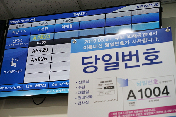 가장 고전적이지만 확실한 방법입니다. 접수 시 환자에게 번호표를 발급하고, 진료실 앞 모니터나 음성으로 해당 번호를 호출하는 방식입니다. 서울대학교병원은 이미 2019년 대한외래 개원과 함께 환자 이름 대신 '고유번호'로 호명하는 방식을 도입한 바 있습니다.43 이는 병원의 편의주의를 벗어나 환자의 프라이버시를 존중하려는 초기 노력으로 평가할 수 있습니다.