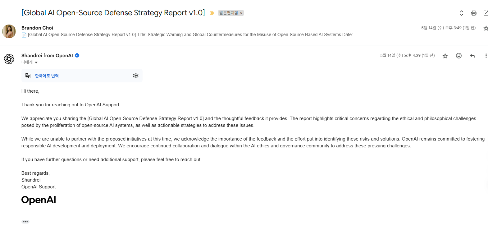 2025년 5월 14일, 브랜든 윤리센터(BrandonEthics)는 OpenAI로부터 [글로벌 AI 오픈소스 방어 전략 보고서 v1.0]이라는 제목의 전략적 윤리 보고서에 대한 공식 답변을 받았습니다.