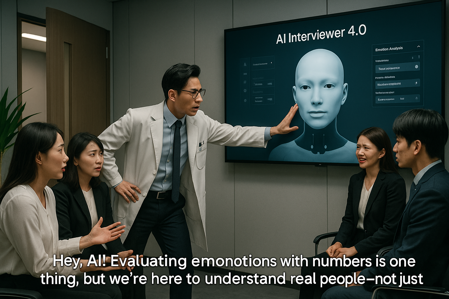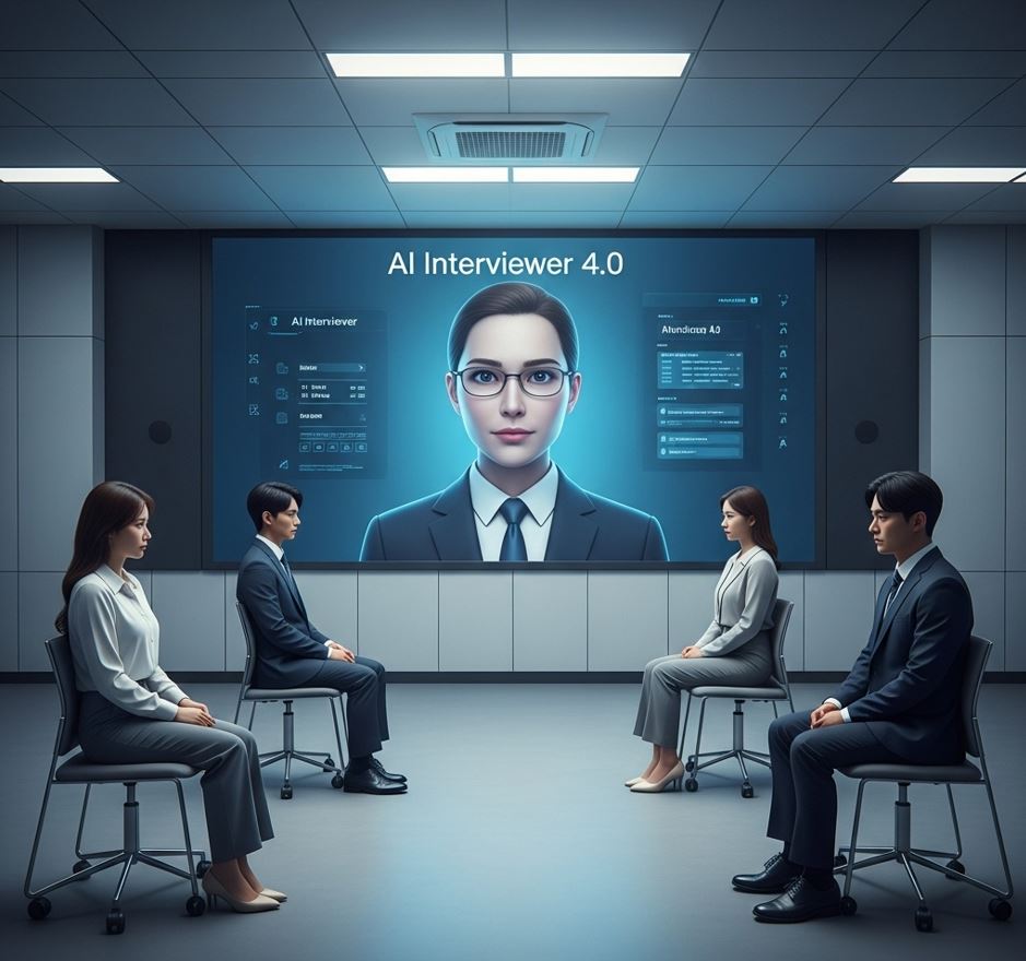 A giant screen displays the interface: “AI Interviewer 4.0.”