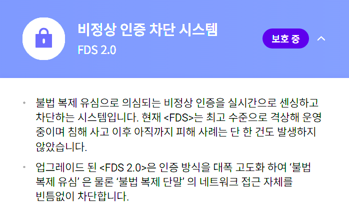 첫째, 비정상 인증 차단 시스템(FDS 2. 0)으로 불법 복제 유심 및 불법 복제 단말의 네트워크 접근을 원천 차단하고 있습니다.